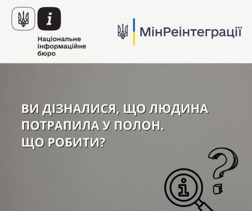 Інформацію щодо потрапляння особи в полон до ворога необхідно повідомляти виключно до компетентних державних органів, нагадує Національне інформаційне бюро (НІБ) при Мінреінтеграції. Потрібно зібрати якомога більше інформації про обставини потрапляння людини у полон. В тому числі від її побратимів, свідків, рідних чи із соціальних мереж. ▪️Отримані дані слід одразу фіксувати, щоб повідомити до: